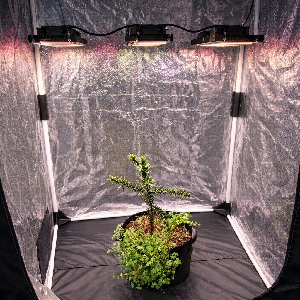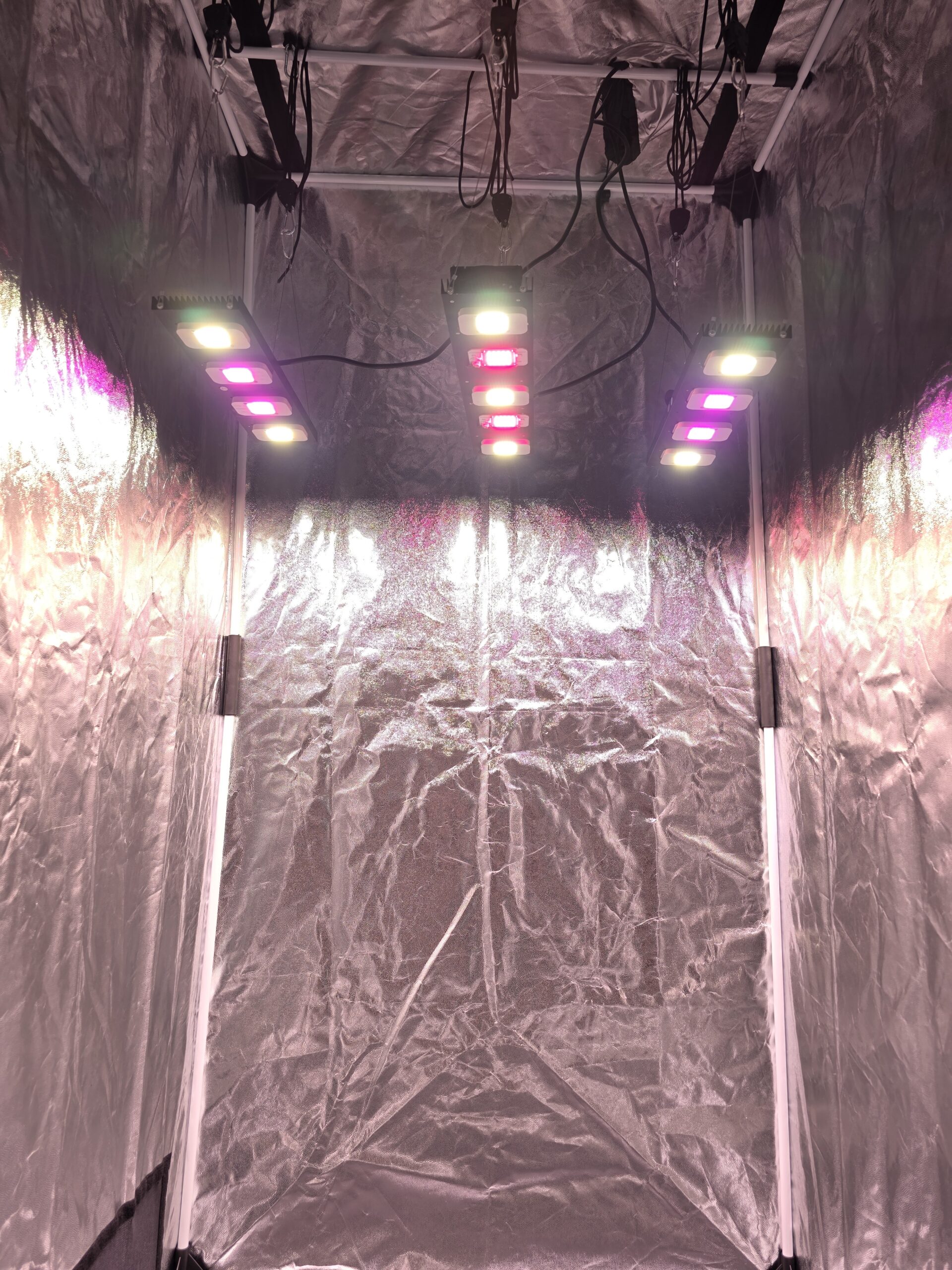 La combinación de 2× Cronos+ 200W Full Spectrum + 1× Cronos+ 250W Deep Red crea una cobertura potente que llena el espacio con luz eficiente, mejorando crecimiento, penetración y floración.