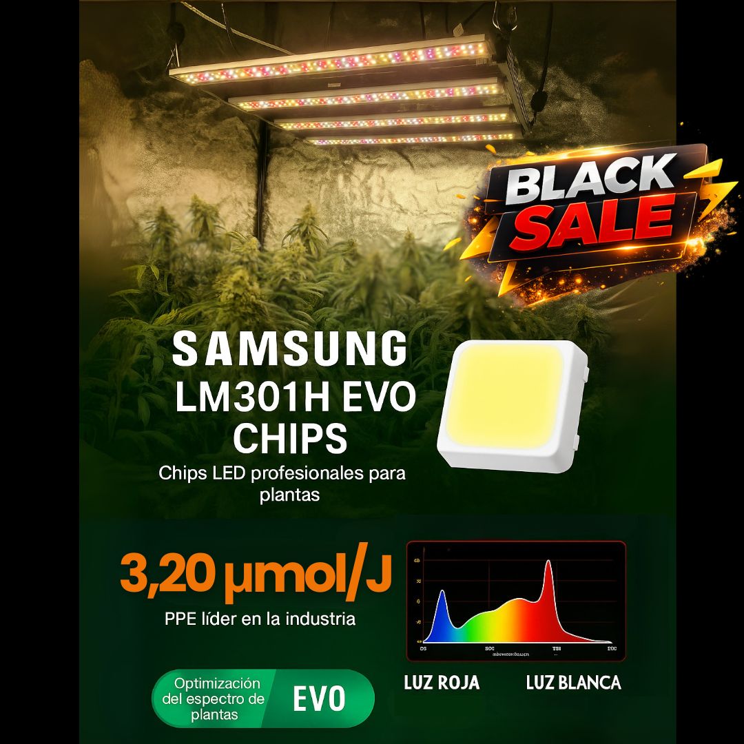 Innovación de última generación en iluminación LED para cultivos indoor. Fabricado con chips Samsung LM301H EVO, garantiza un rendimiento superior y eficiencia optimizada. Ideal para áreas de 80×80 a 100×100 cm, cuenta con dimmer regulable e interruptor para alternar entre los espectros de crecimiento y floración.